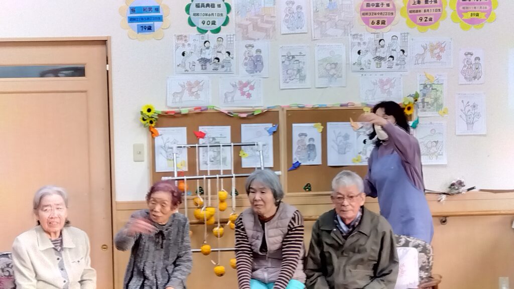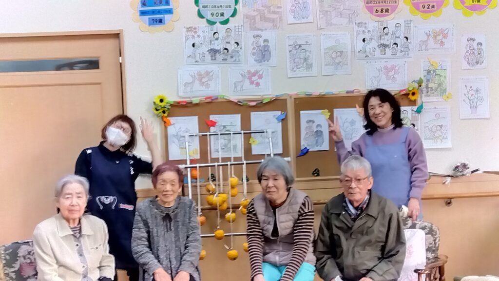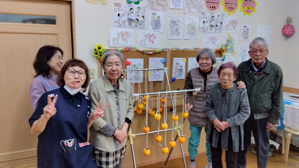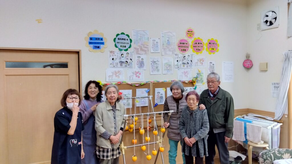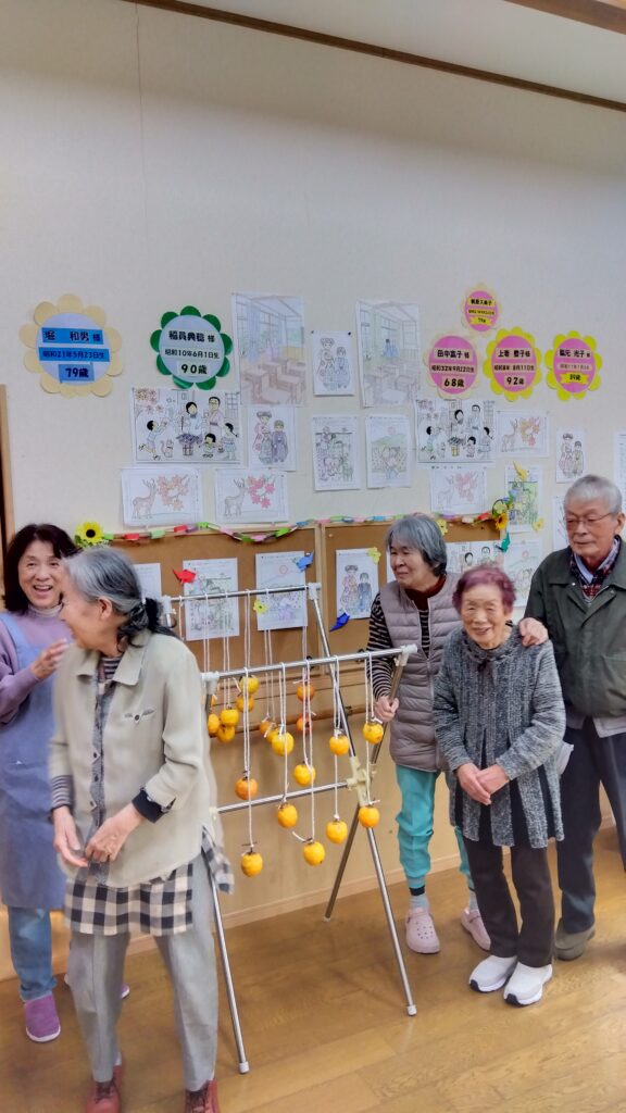 (指導者あり) 今年は干し柿を作ってみました。 ご利用者様に皮むきと、紐結びを手伝ってもらい。 昔やっていたコツなどを話しながら、 干し柿作りをされていました。 完成が待ち遠しいと干し柿を眺められていました。