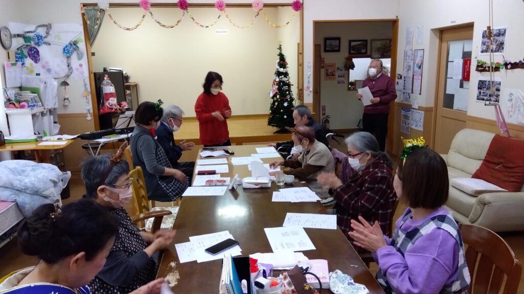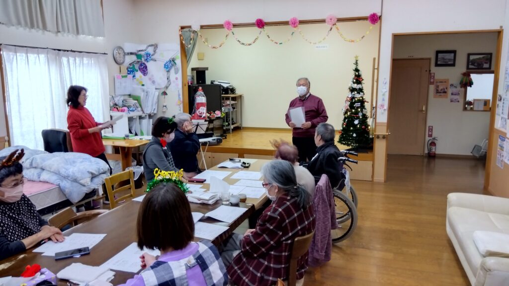 今年もクリスマスを開催しました。 日頃から練習をしている演奏や合唱、職員による日本舞踊 何が入っているかわからない、くじ引き式プレゼント交換 最後はみんな、はしゃぎすぎて集合写真を撮るのを忘れて今いました。 面目なし!!